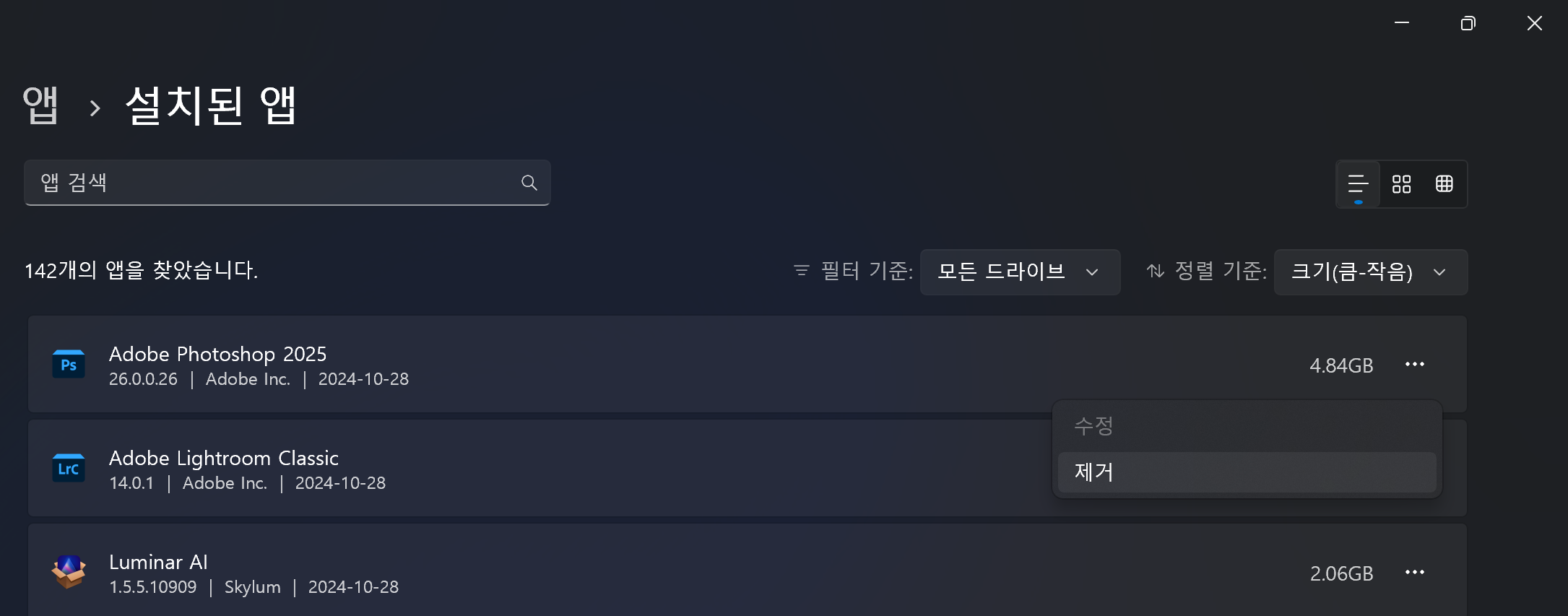 - 사용하지 않는 앱 우클릭 → 제거