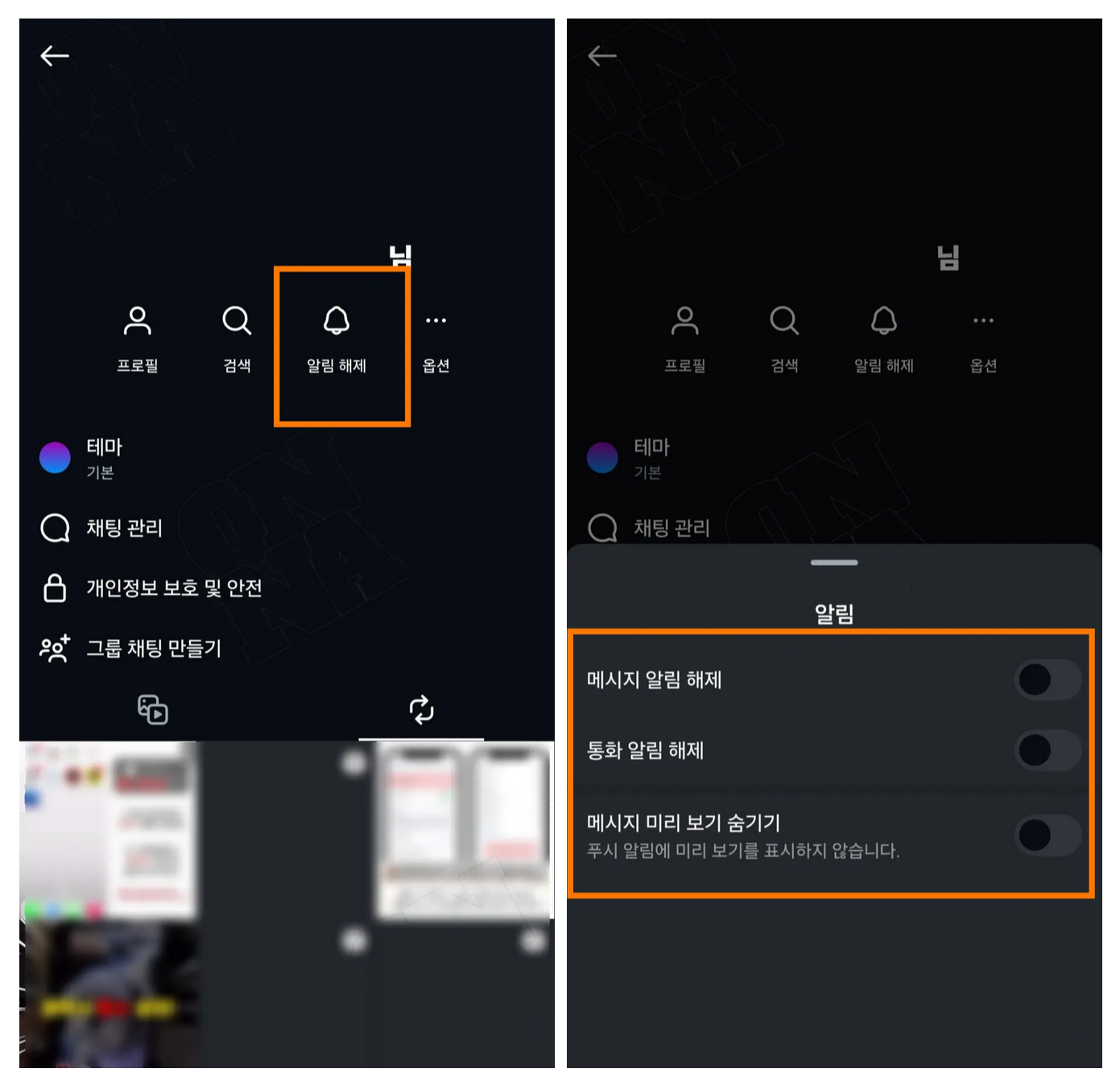 - 상단의 프로필 이름을 탭한 뒤 '알림 끄기'를 선택합니다.