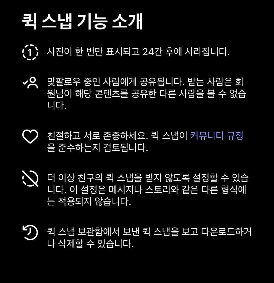 퀵스냅마팔(맞팔로우) 상태인 사용자끼리만 사용할 수 있는 기능으로, 정해진 리스트 안에서만 사진을 공유할 수 있습니다. 한 번 보면 바로 사라지는 것이 핵심입니다. 스토리처럼 24시간 유지되는 콘텐츠가 아니라, 단 한 번, 약 10초 동안만 볼 수 있는 일회성 공유입니다.