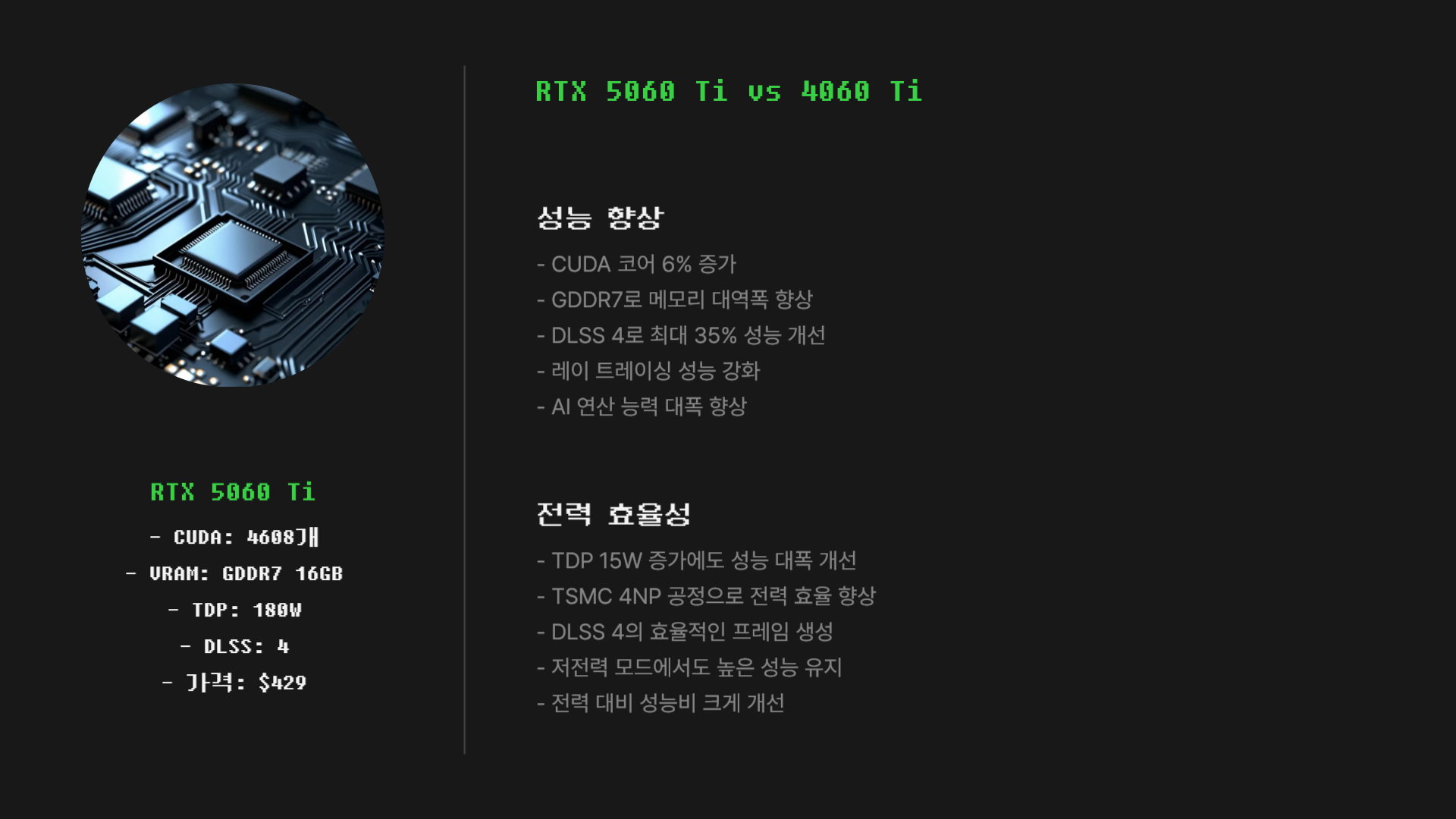 이처럼 RTX 5060 Ti는 성능 향상을 이루면서도 가격은 더 낮아, 교체를 고려하는 사용자에게 가격 대비 만족도가 높은 제품이라 평가됩니다.