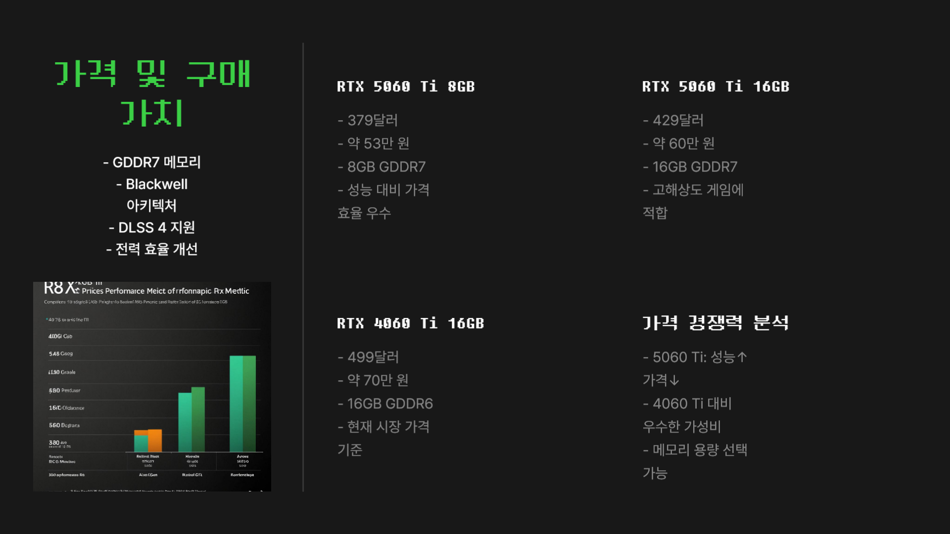 CUDA 코어 수, DLSS 버전, 메모리 규격(GDDR7) 등에서 RTX 5060 Ti가 앞서는 모습을 보이며, 가격 또한 다소 낮은 수준에서 출시된 점이 인상적입니다.