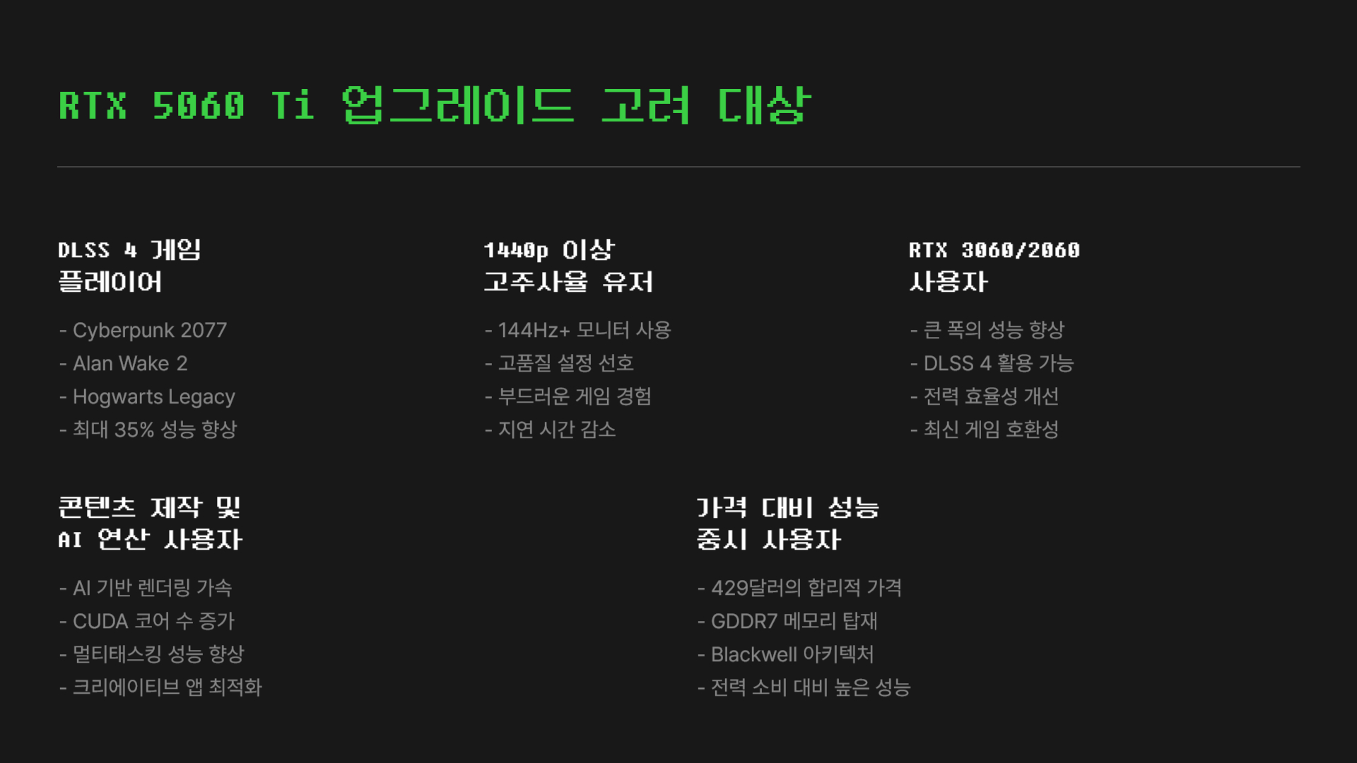 다음 조건에 해당한다면, RTX 5060 Ti로의 업그레이드를 고려할 가치가 충분합니다.