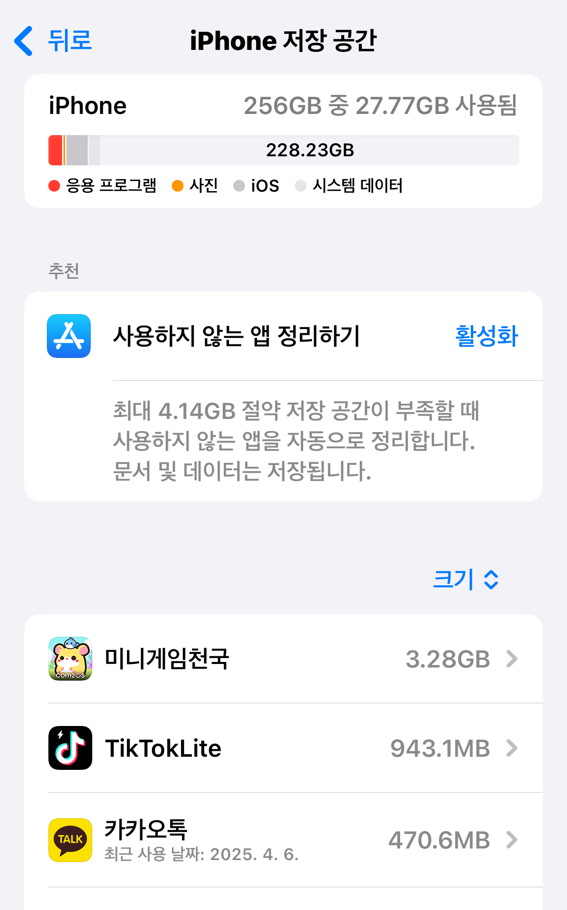 에서 확인 가능하며, 카카오톡이 단일 앱 중 가장 많은 저장 공간을 점유하는 사례도 많습니다.