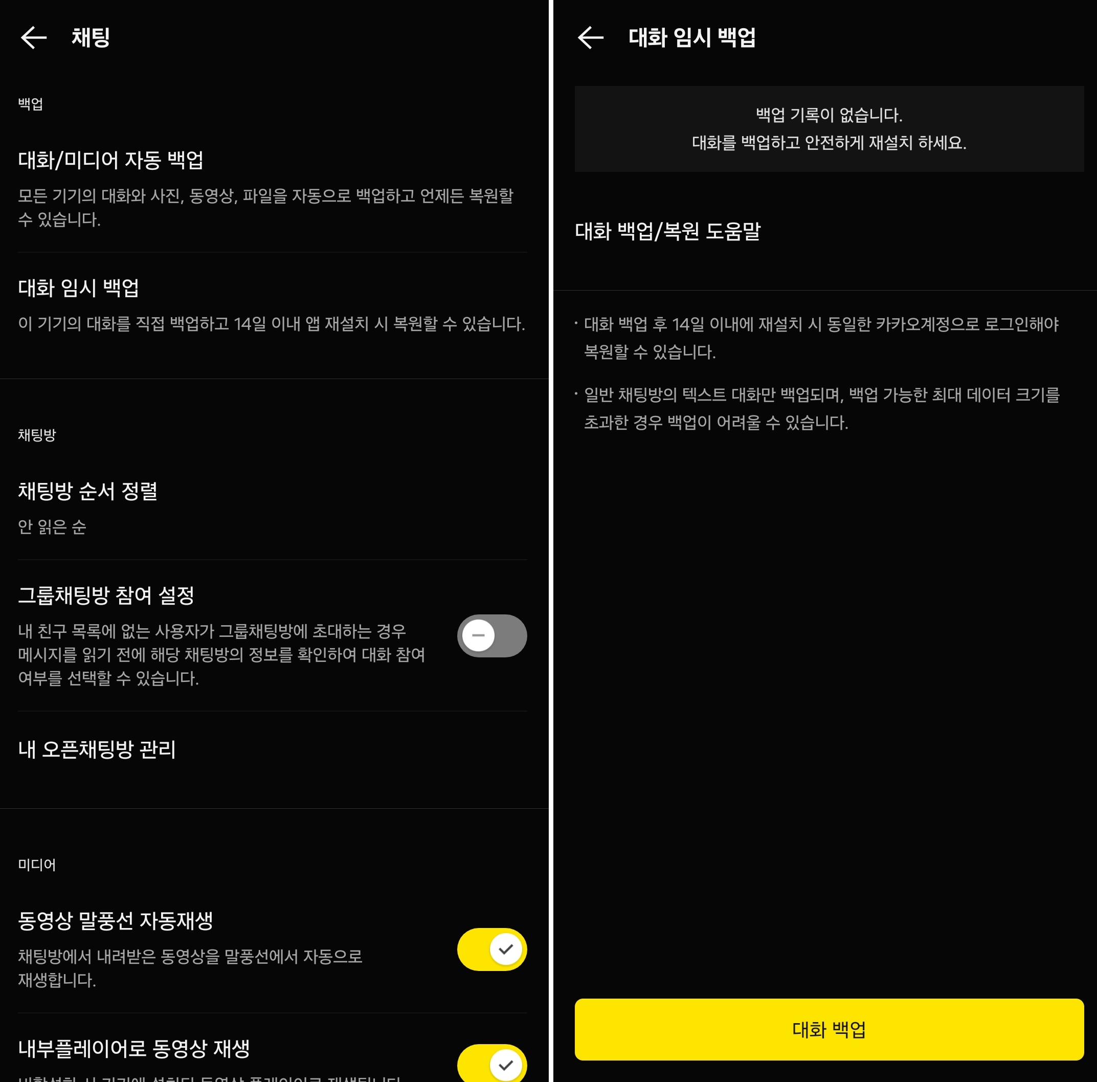- 카카오톡 전체 설정 → 채팅 → 대화 백업