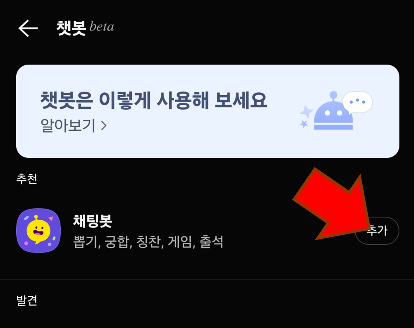 챗봇 기능을 사용하려면 먼저 채팅방에 챗봇을 직접 추가해야 합니다. 다음 절차를 따르십시오.