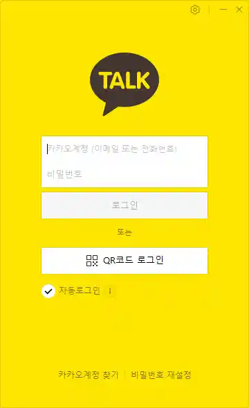 설치 완료 후 첫 실행 시 로그인 과정이 필요합니다. 로그인은 전화번호 또는 이메일 주소를 통해 진행하며, 비밀번호가 기억나지 않는 경우 [카카오계정 찾기] 또는 [비밀번호 재설정] 기능을 사용할 수 있습니다.