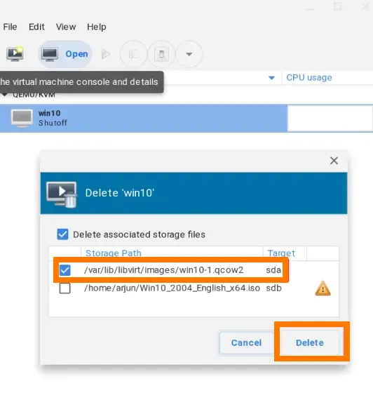 - 삭제: 가상머신을 삭제하려면 가상머신 관리자에서 마우스 오른쪽 버튼을 클릭하고 "삭제"를 선택합니다. "sda" 대상이 선택되었는지 확인하고 "삭제"를 클릭합니다. 윈도우 11 ISO 파일도 함께 삭제할 수 있습니다.