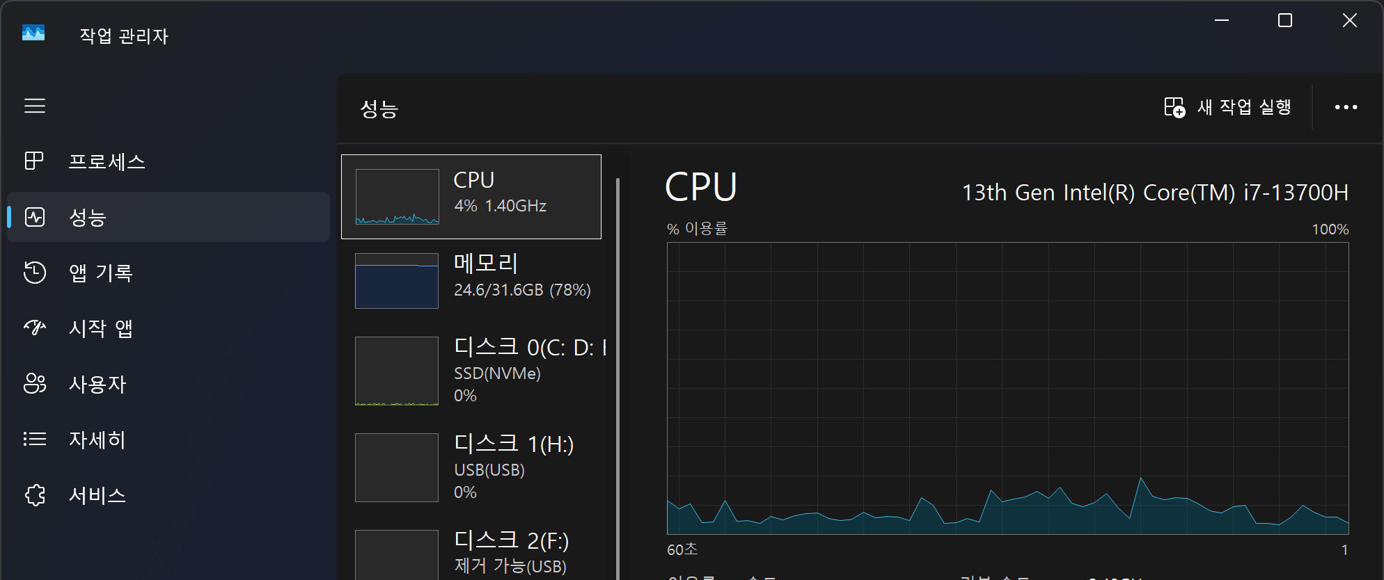 - '성능' 탭을 선택하면 CPU, 메모리, 디스크, GPU 등의 현재 사용량과 사양을 확인할 수 있습니다.