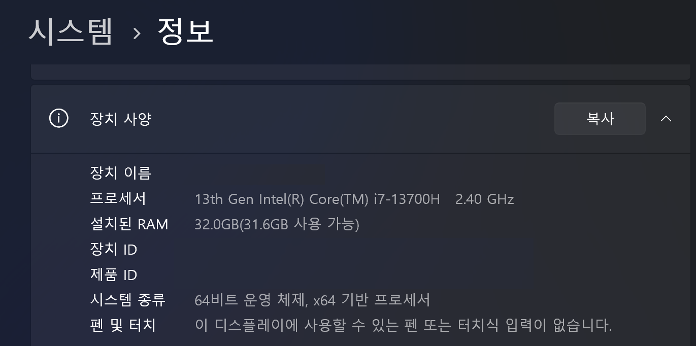 | 운영체제 | 윈도우 버전, 비트 종류 | 설정 > 시스템 > 정보 |