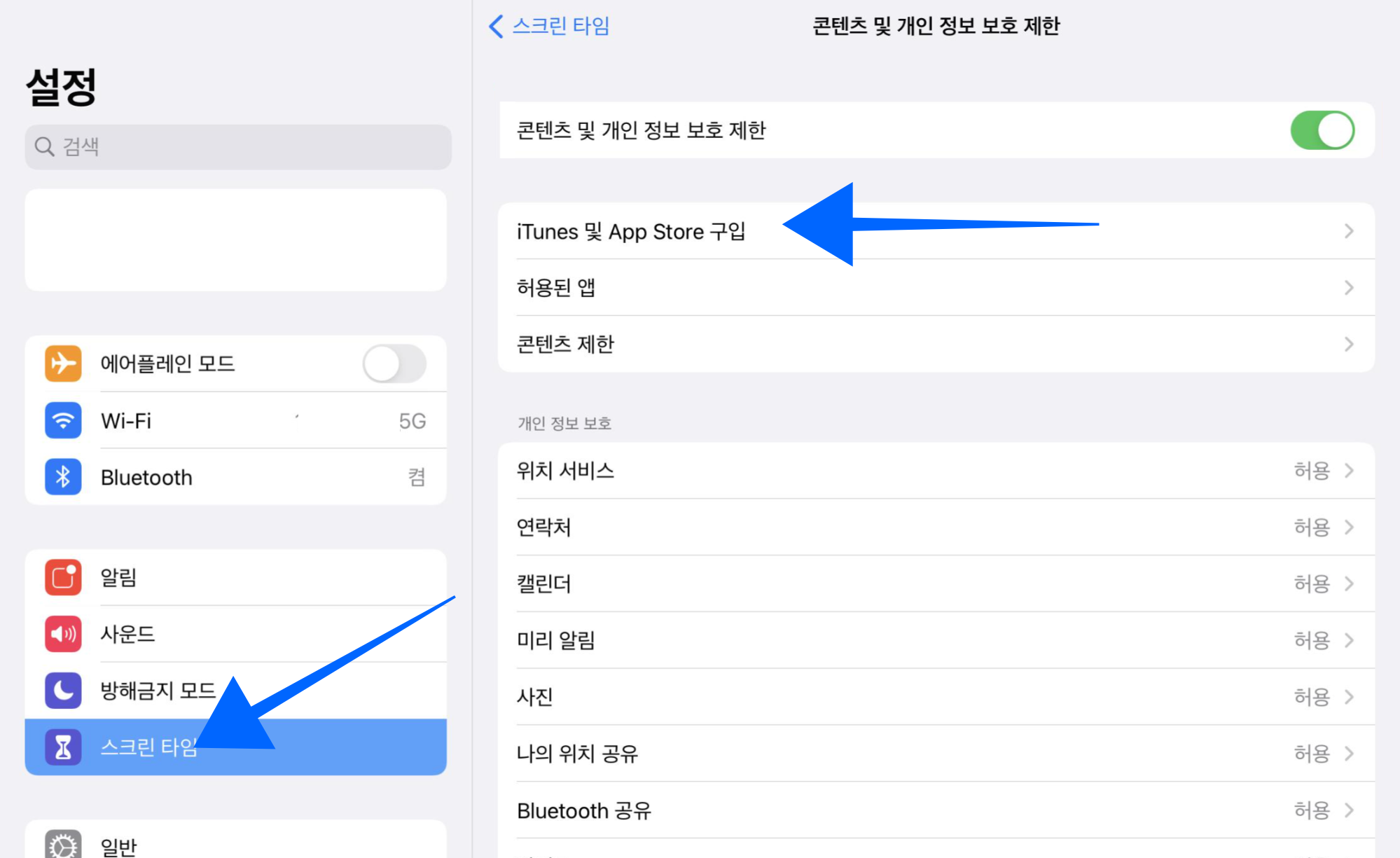 - 아이패드에서 설정 > 스크린 타임 > 콘텐츠 및 개인 정보 보호 제한으로 이동합니다.