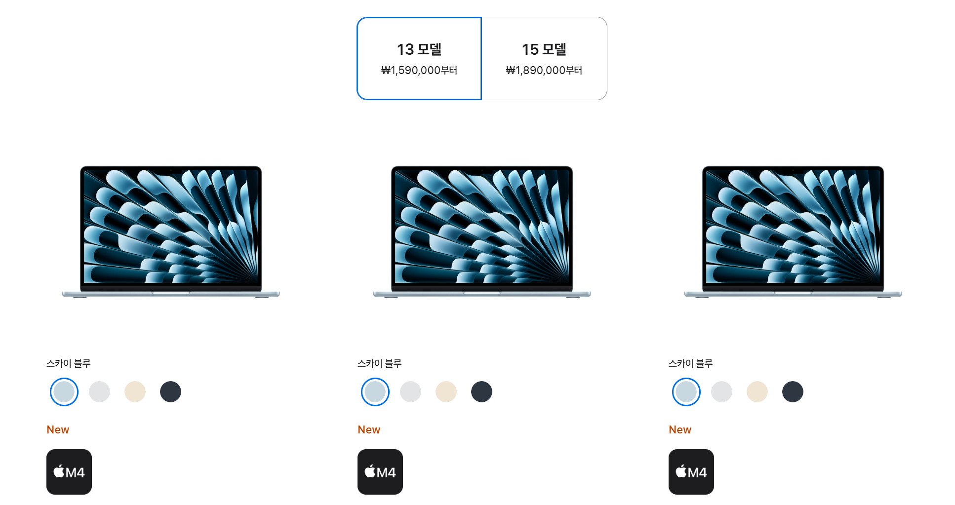 - 맥북 에어 13 (M4): 1,590,000원부터 (교육용은 1,440,000원부터)