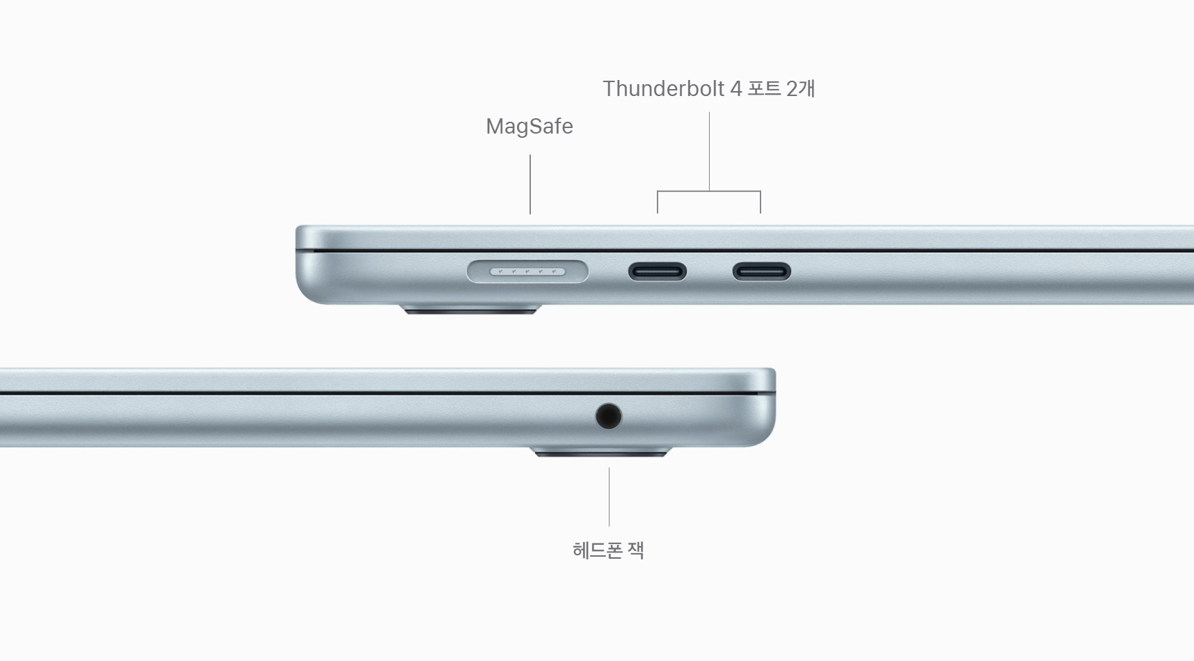 - 연결성: Wi-Fi 6E, Bluetooth 5.3, MagSafe 충전, Thunderbolt 포트 2개, 3.5mm 헤드폰 잭