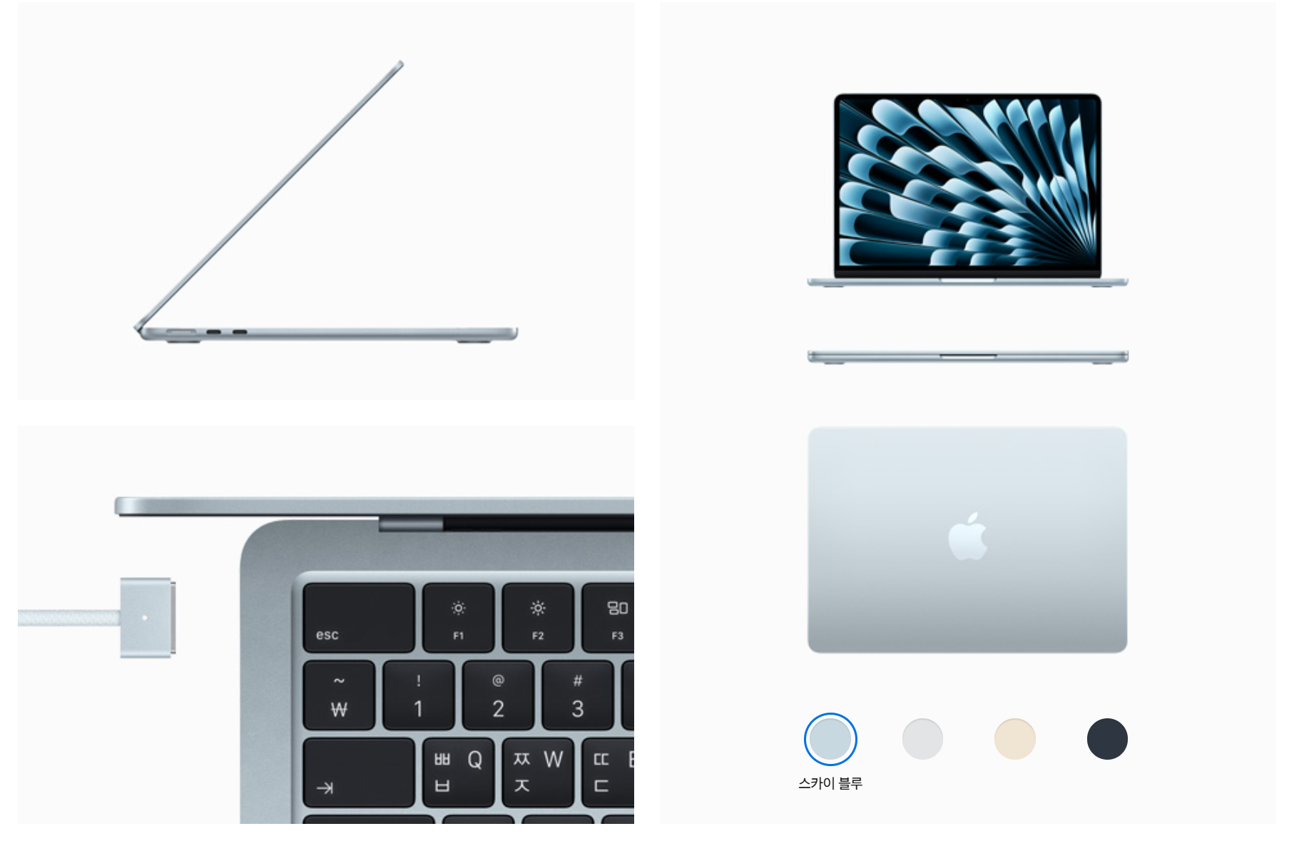 새로운 맥북 에어는 얇고 가벼운 팬리스 디자인을 유지하면서도, 견고한 unibody 알루미늄 외장을 갖추고 있어 뛰어난 내구성을 제공합니다. 특히, 이번 모델에는 새로운 색상인 스카이 블루가 추가되어 사용자들의 선택 폭을 넓혔습니다.