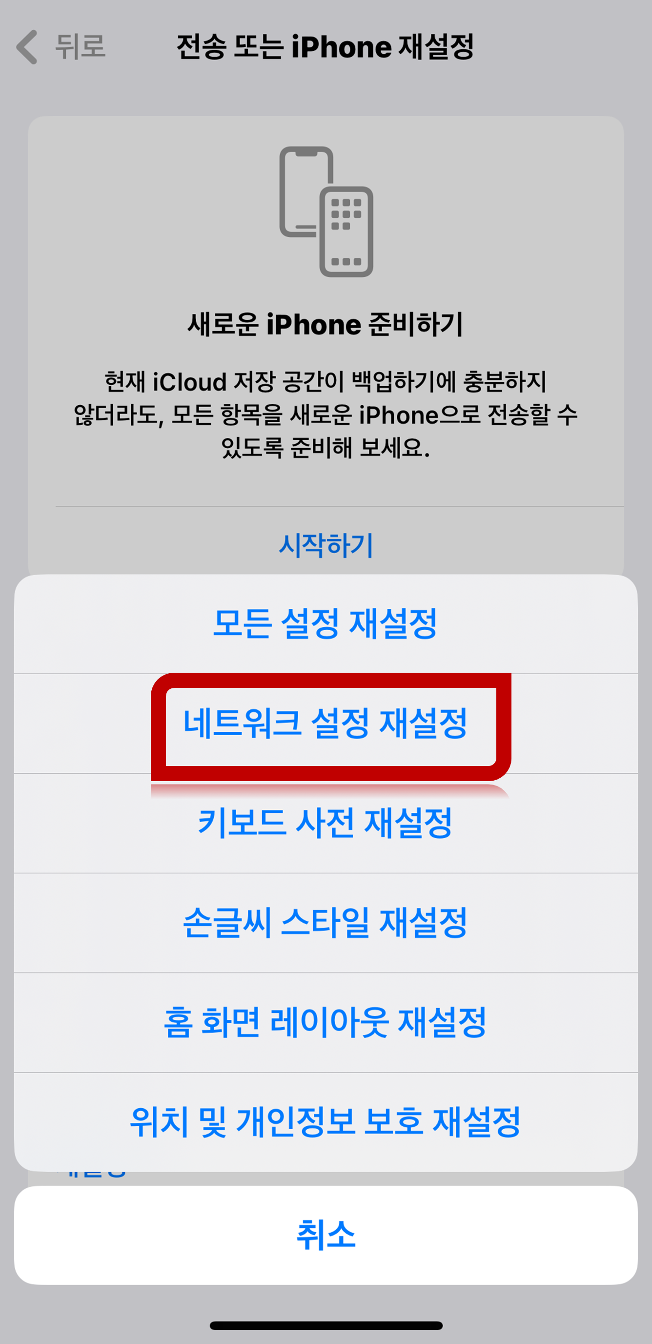 설정 > 일반 > 전송 또는 기기 초기화 > 네트워크 설정 재설정 항목을 선택하면, 와이파이 및 블루투스 정보가 초기화됩니다. 네트워크 관련 문제로 인한 오류라면 해당 방법이 효과적입니다.