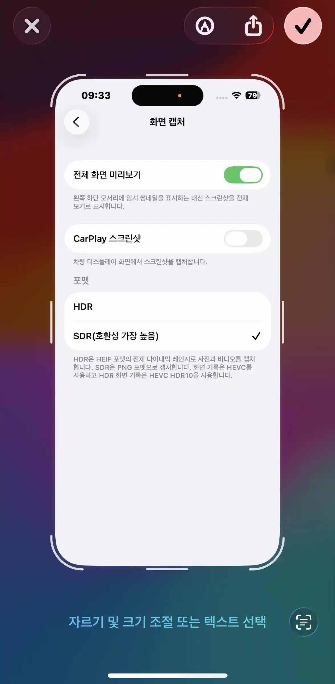 - 형식(Format): 스크린샷의 기본 저장 포맷을 설정하는 기능으로, JPG 또는 HEIC 등을 선택할 수 있습니다.